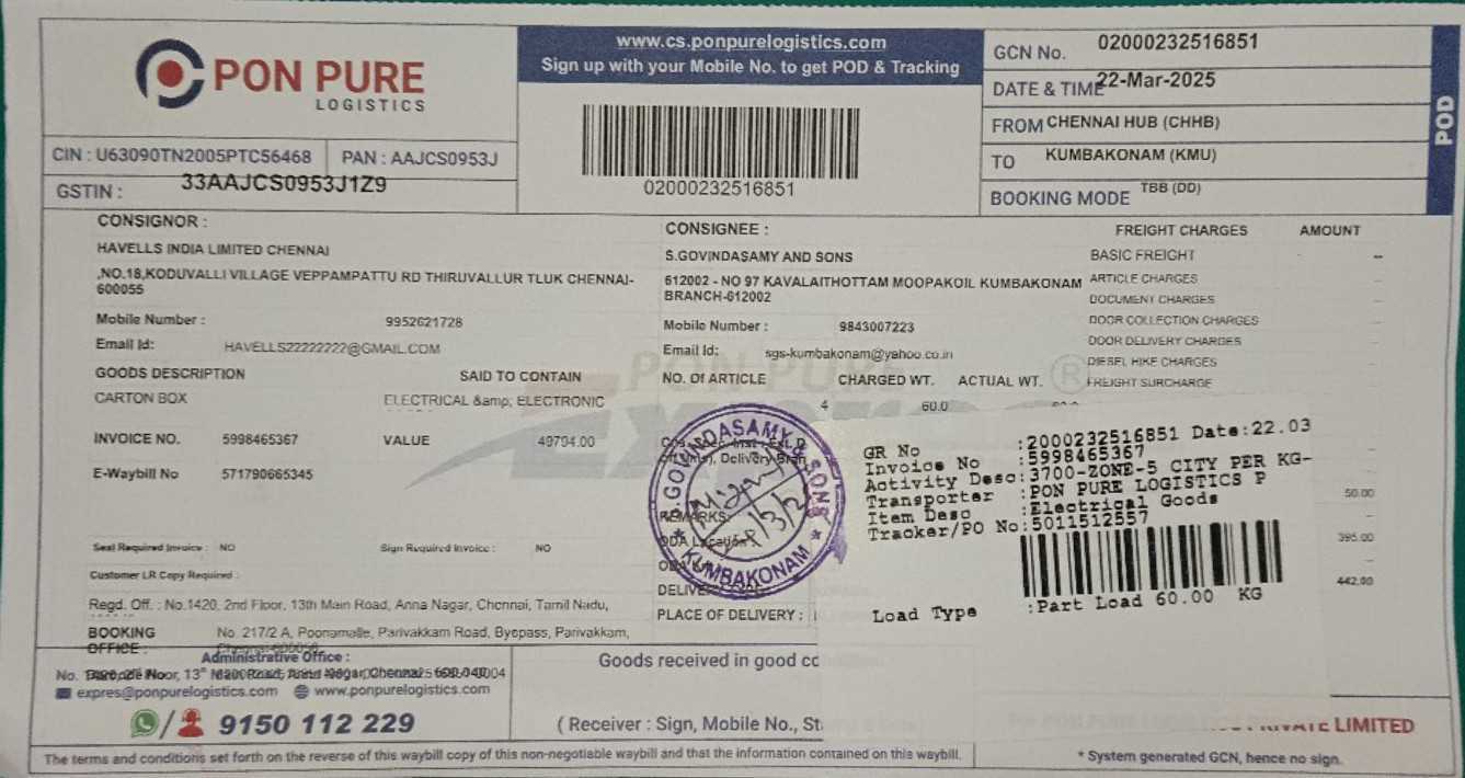 | 25-Mar-2025 | 02000232516851 | 22-Mar-2025 | S.GOVINDASAMY AND SONS | Jagatheesh | PENDING WITH DELIVERY AGENT | KUMBAKONAM | CENTRALISE MIS | |